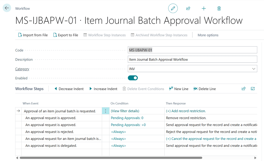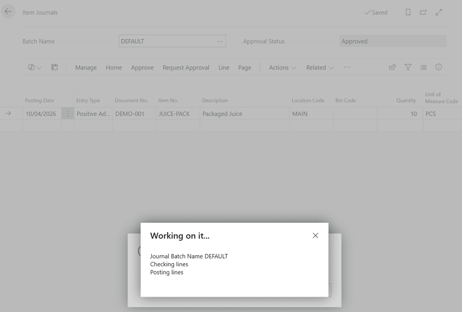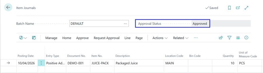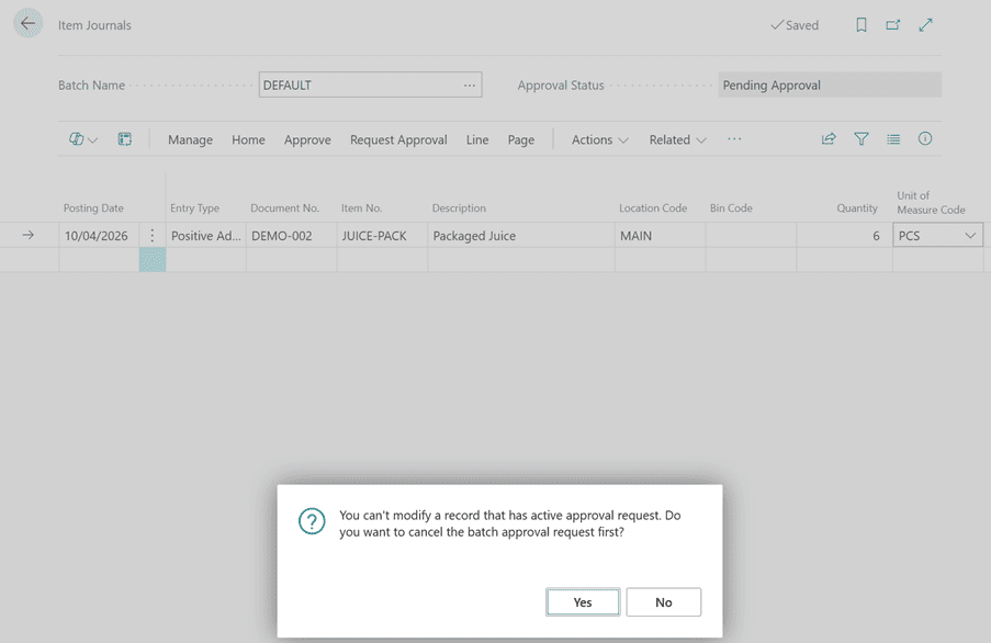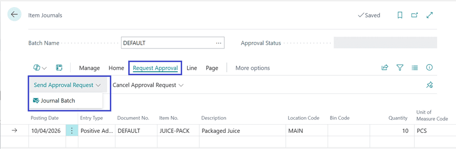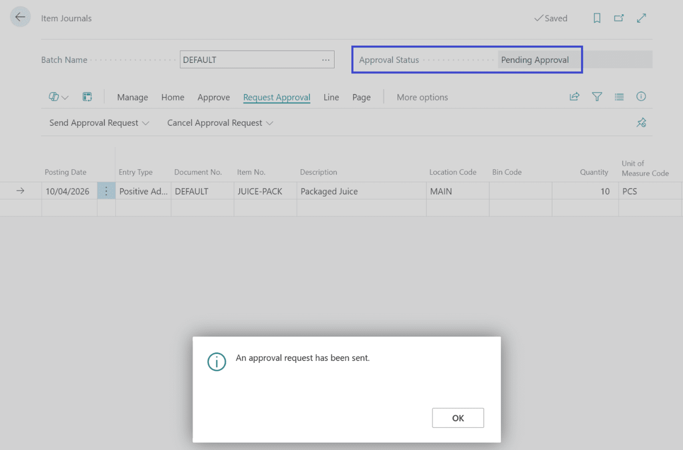 Note: You cannot edit, delete and post the Item journal entry during the time approval is in progress. The restrictions remain until the approval request is approved or cancelled.