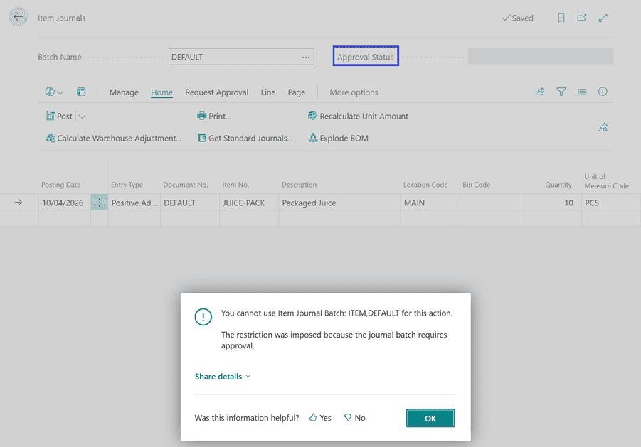 Now when you try to post the item journal error message pops up: “The restriction was imposed because the journal batch requires approval.”