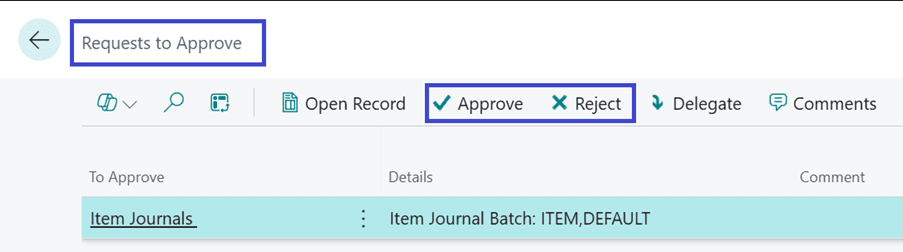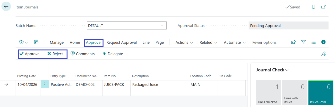 Alternatively, Approver will see the action enabled on Item Journal, if any approval is pending.